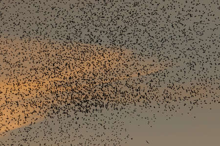 Starling murmurations. A large flock of starlings fly at sunset just before entering the roosting site in the Netherlands. Hundreds of thousands of starlings make big clouds to protect against raptors