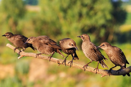 Young flock of starlings sitting on a branch , wildlife, unique frames