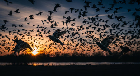 Flock of birds taking flight against a vibrant sunset over a tranquil landscape