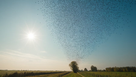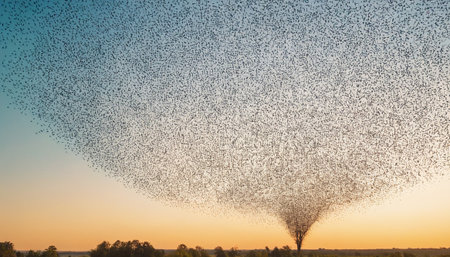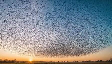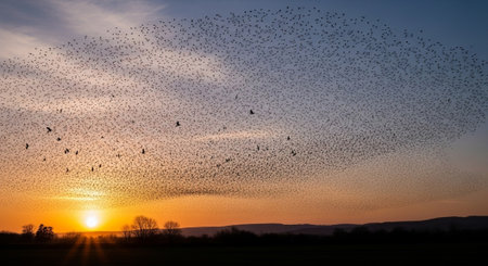 Silhouette of a massive flock of starlings flying together in the sky, creating mesmerizing natural patterns and symbolizing unity and freedom.