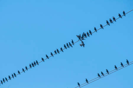a few small birds a rest, sitting on the lines of high-voltage electric poles against the sky. Photographed close-up bottom.