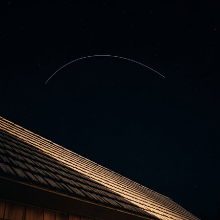 Night sky with stars and moon over the roof of a wooden house