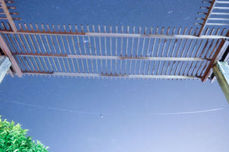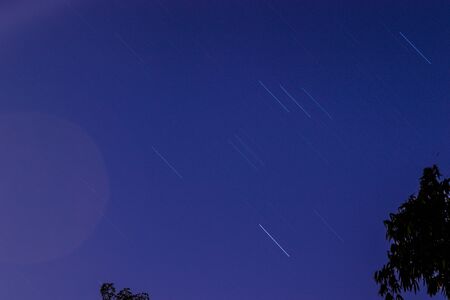 Long exposure shot of sky with stars at night. Star trails photograph. Falling stars background.