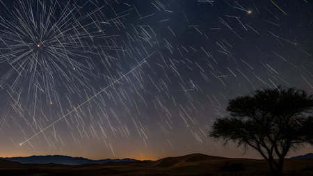 A spectacular night sky filled with star trails and a meteor shower radiates from a central point. The cosmic display hangs over a desert landscape featuring a silhouetted tree and distant dunes, capturing the wonder of the universe.