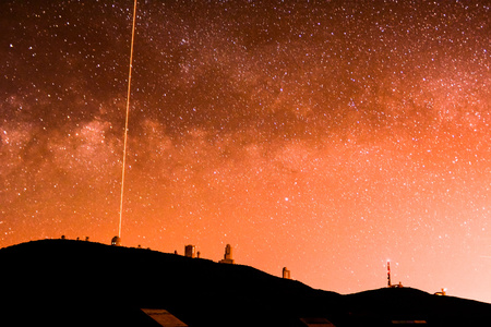 Night sky with stars and a bright green laser beam. Starry sky with laser rangefinder