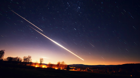 Shooting star leaves a glowing trail against the dark night sky