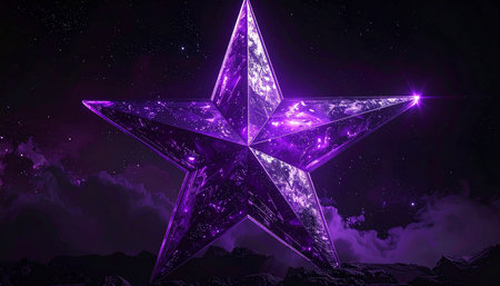 A massive, faceted purple star stands on dark, rocky ground beneath a starry night sky with nebulae.