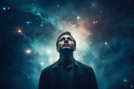 Young man looking at night sky with stars and nebula in the background