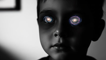 A close-up monochrome portrait depicts a young child with striking eyes. The eyes are replaced with swirling galaxies, creating a surreal and imaginative visual. The image features high contrast, shadows, and a focus on the subject's face. This image could be used for various conceptual or artistic projects.