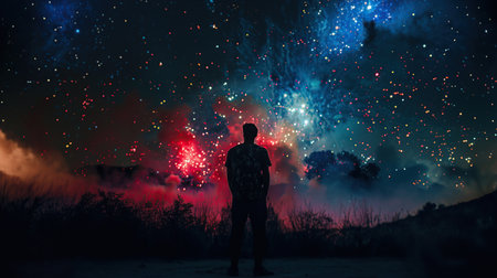 Silhouette of a man contemplating the beauty of a colorful cosmic nebula in space