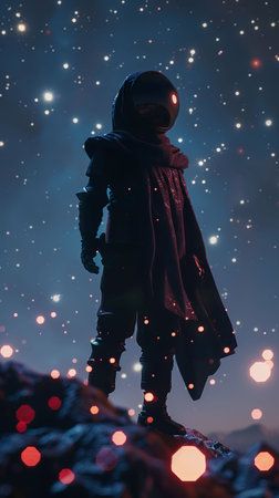 Space traveler, Robes, Brave adventurer, Exploring cosmic anomalies, Starlit, 3D Render, Silhouette lighting, Bokeh effect, Tracking shot view