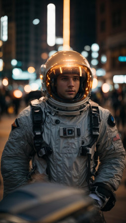 An AI-generated illustration of A male wearing a silver astronaut suit with an inquisitive expression