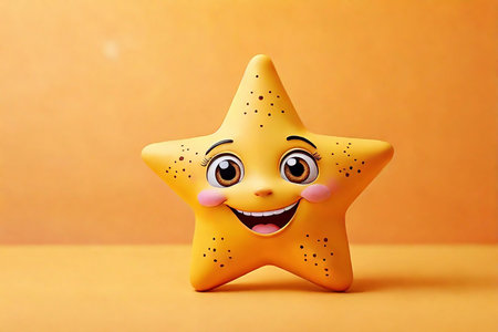 Funny yellow star on orange background. Cute yellow star with happy face. Yellow star with smile.