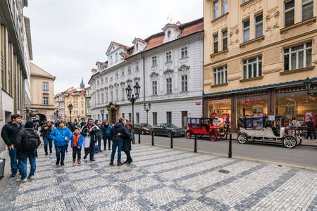 PRAGUE, CZECHIA - NOVEMBER 2, 2019: Crowd of tourists on a square on Nerudova street, a pedestrian alley of Hradcany hill, on the Prague Castle, surrounded by people and shops.