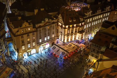 PRAGUE, CZECH REPUBLIC - DECEMBER 3, 2016. Top shot of tourists on old town square. Ancient european city view
