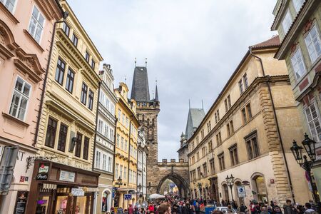 PRAGUE, CZECHIA - NOVEMBER 2, 2019: lesser town bridge tower of Charles Bridge, also called malostranska mostecka vez in Prague, Czech Republic, surrounded by crowded narrow medieval streets & houses.
