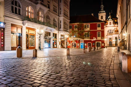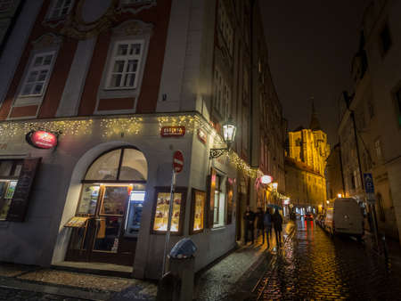 PRAGUE, CZECHIA - NOVEMBER 3, 2019: Karlova and Husova streets by night with tourists passing by. The street, with cobblestone, is a landmark of the city center of Prague, Stare Mesto, with restaurants & bars.