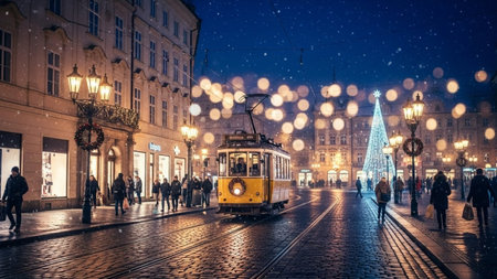 Trams on the streets of Prague at Christmas time.