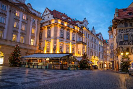Prague, Czech Republic - 3.12.2019: Christmas city view of the Old Town square in Prague at early morning when all stands are still closed, Czech Republic