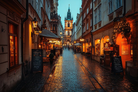 Cobblestone street with illuminated buildings and Charles Bridge in the background at twilight in Prague, Czech Republic