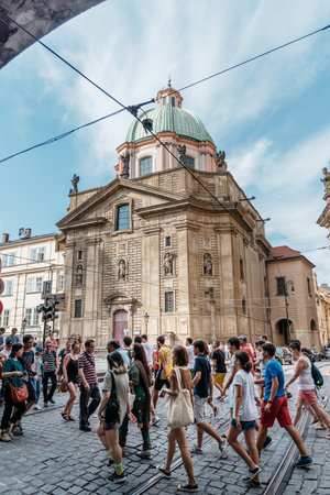 PRAGUE, CZECH REPUBLIC - AUGUST 28, 2014: tourists and locals walk in the ancient streets of Prague