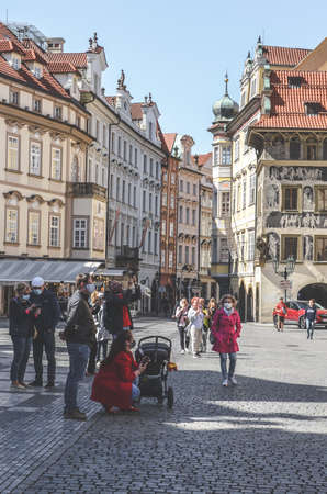 Prague, Czech Republic - April 23, 2020: People wearing medical face masks in the Old Town Square by the famous Astronomical Clock Orloj. City center during coronavirus pandemic. COVID-19 crisis.
