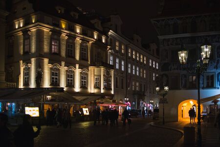 PRAGUE, CZECH REPUBLIC - OCTOBER 2019. Residents, guests of the city on Night streets walking to see the sights. Travel old European city. Autumn season. Night photography ,high sensitivity.