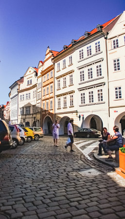 Prague, Czech Republic, May 13, 2019: people tourists are walking down cobblestone street in old historical city centre Lesser Town Mala Strana district with colorful buildings, Bohemia
