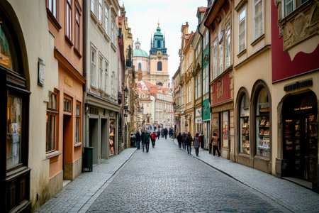 Prague, Czech Republic - June 2022: Pedestrian cobblestone street with outdoor restaurants and cafe in the center of Prague