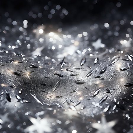 Bokeh showing macro view of a shimmering silver glitter surface with soft focus bokeh and starburst highlights creating a and sparkling abstract background...