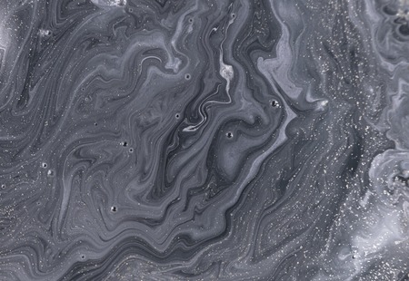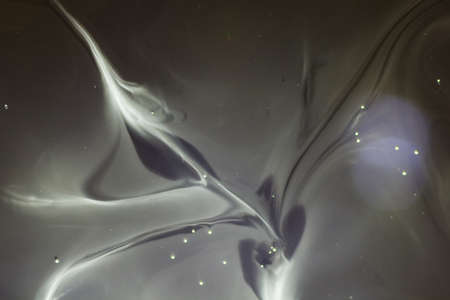 Paint layers. Marble texture. Blur white black gray grain particles acrylic ink emulsion fluid blend wave abstract art background.