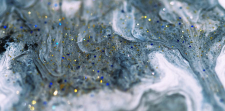 Sparkling fluid wave. Glitter paint flow. Defocused gray white color ink liquid with metallic blue golden shiny sequin particles spill abstract art background.