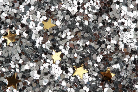 A close-up shot of numerous small, shiny golden star-shaped confetti pieces scattered randomly across a bright, shimmering silver glitter surface, creating a festive and celebratory atmosphere.