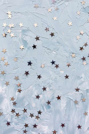 Trendy silver foil confetti stars on blue background. Christmas festive abstract backround. Birthday party, New Year, Christmas celebration, holidays, winter and dreams concept