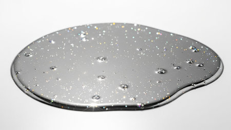 A close-up view of a smooth, amorphous puddle of liquid silver metal. The surface is highly reflective, with subtle highlights and soft shadows. Tiny, sparkling particles, resembling crystal dust or fine glitter, are dispersed throughout the liquid, catching the light and creating a shimmering effect. The overall aesthetic is clean, minimalist, and subtly