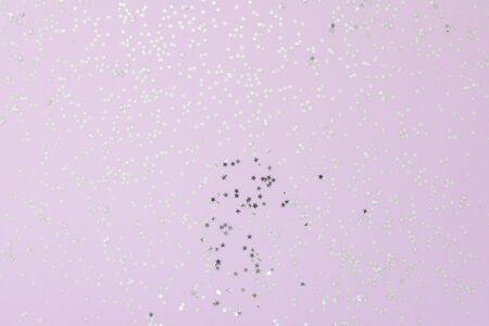 Festive background , lilac background with glitter silver stars, flat lay, top view