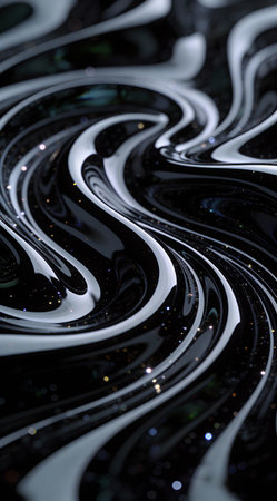 This mesmerizing black and white abstract image features swirling patterns and sparkling effects, perfect for creative backgrounds or artistic projects.