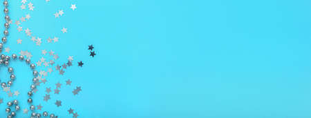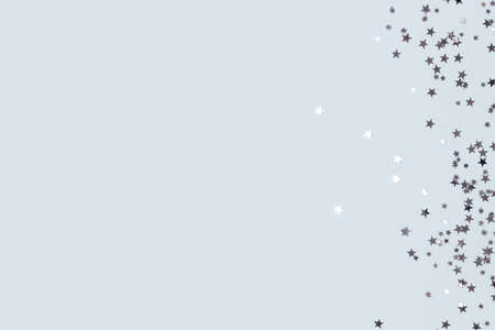 Metallic silver glittering stars confetti scattered on a blue pastel background with copyspace.
