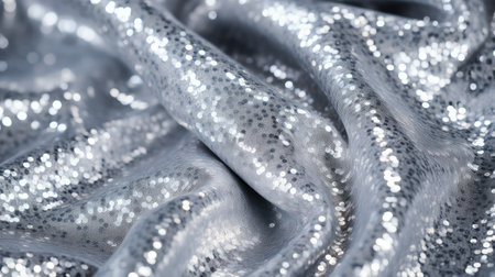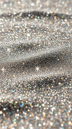 A sparkling silver glitter backdrop with large and glitter small specks dancing in the light. The shimmering texture adds a luxurious and glamorous touch, ideal for party decorations, fashion photography, or chic event invitations.