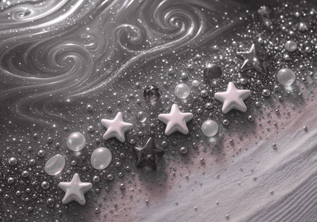 Abstract black and white background with stars and pearls. Top view.