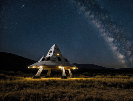 The cockpit showcases a stunning view of the night sky filled with stars, highlighting the vastness of space.
