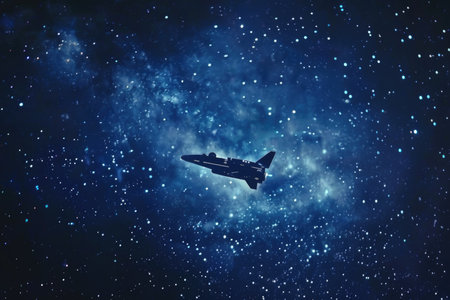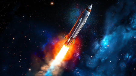 Space shuttle launches in starry sky.