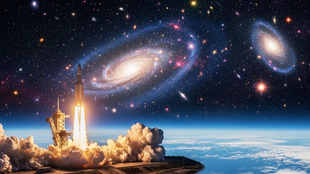 Spacecraft launch into space. Cosmos art.