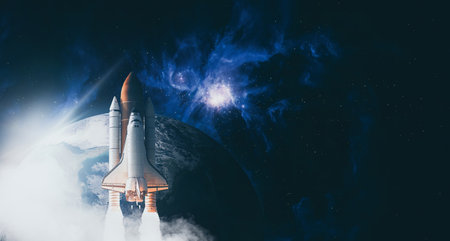 Shuttle launch in the clouds to outer space. Dark space with stars on background.Spaceship flight.
