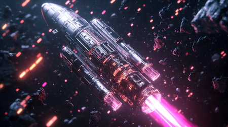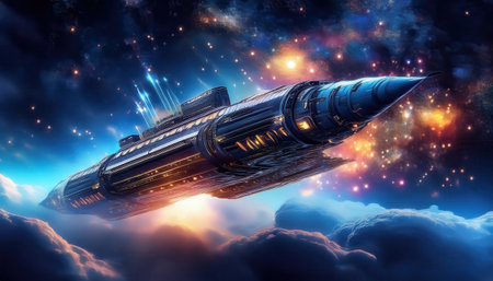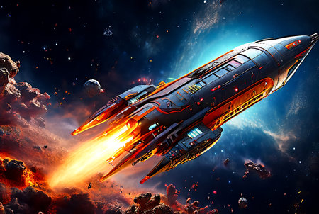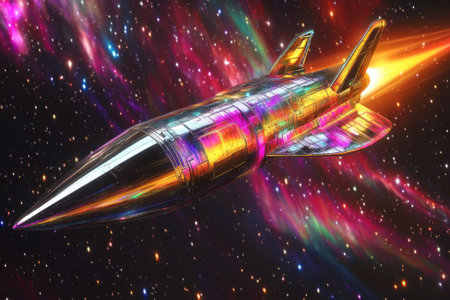 Futuristic rocket design flying through a colorful cosmic space environment at night