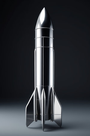 A vibrant, stylized rocket ship is featured against a stark black background. The image showcases a gradient of colors across its metallic surface. The composition utilizes a studio-style lighting setup. Suitable for commercial projects or editorial content relating to technology and the future.