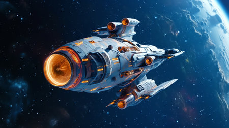 futuristic spaceship in orbit above earth