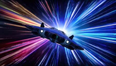 A powerful spaceship hurts through hyperspace, its engines blazing with energy as it traverses the cosmos at incredible speeds, captured in a moment of interstellar travel