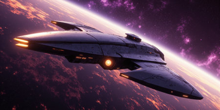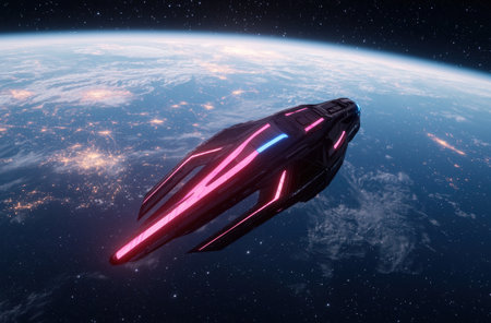 Futuristic spaceship with glowing lights orbiting earth in a dark cosmic environment