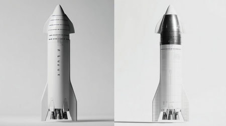 Starship SN20, reusable super heavy lift launch vehicle rocket. Spaceship 3D image without and with heat shield hex tiles thermal protection. Space x starship spaceflight to the Earth orbit